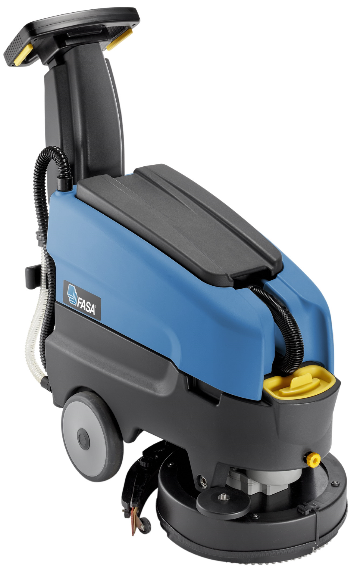 Čistiací stroj na podlahu A1.5 36 E Fasa. Kompaktný sieťový umývací stroj, napájanie 230 V, umývacia šírka 360 mm, dĺžka sušiace lišty 460 mm, otáčanie na malom priestore, systém rýchlej výmeny kotúča