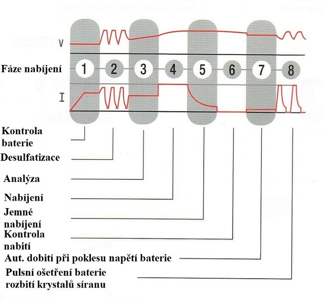 - Automatický režim nabíjania je rozložený do 8 fáz - viď diagram