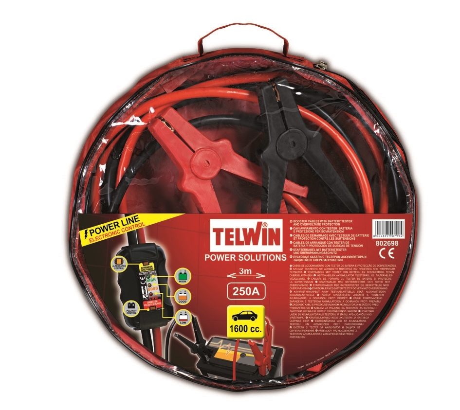 Štartovacie káble 250 A Telwin pre núdzové naštartovanie, dĺžka 3 m, s testerom batérie-indikácia nabitia 3 ľad diódy.
